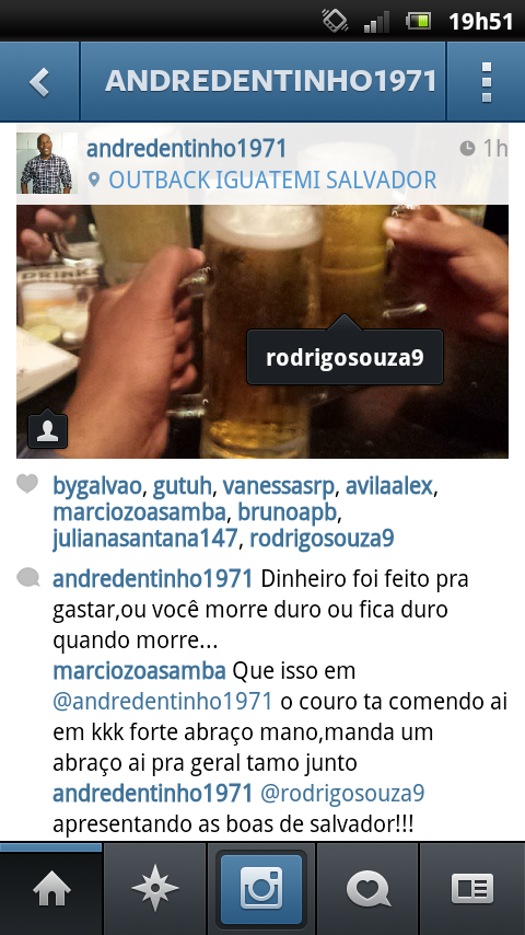 Autor da postagem, o amigo André Dentinho escreveu que Souza estaria lhe "apresentando as boas novas" da cidade. O ex-camisa 9, inclusive, "curtiu" a imagem dos chopes. Confira abaixo:
